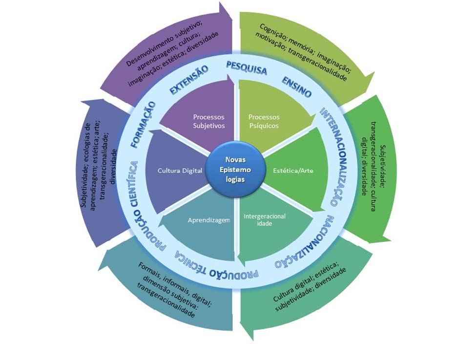 Como podemos identificar na imagem a seguir, produzida por meio do cruzamento das expertises individuais das proponentes, os três movimentos em torno do que reconhecemos como ‘novas epistemologias’ já vem se consolidando nas ações de pesquisa, ensino, extensão, internacionalização, nacionalização, produção técnica e científica das proponentes, transversalizadas em 6 (seis) blocos temáticos afins ao desenvolvimento humano, a saber: processos subjetivos, processos psíquicos, estética/arte, intergeracionalidade, aprendizagem e cultura digital.